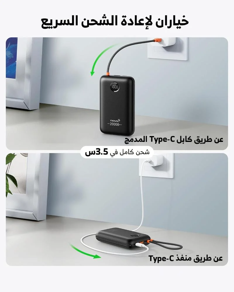 - كابلات مدمجة مزود بكابل Type-C (PD) وكابل آيفون مدمجين لراحة قصوى.