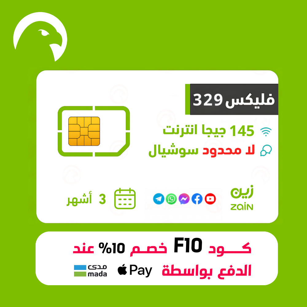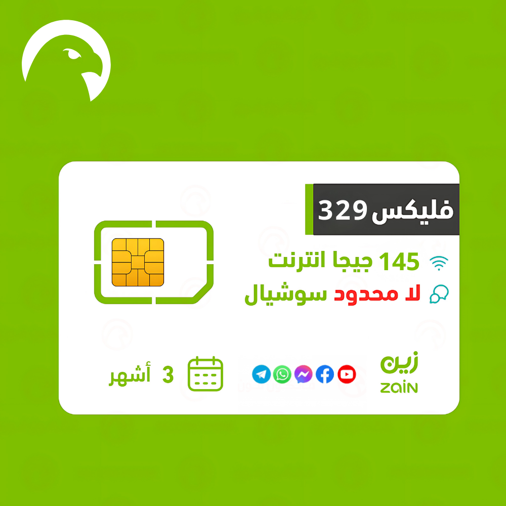 زين | شريحة وباقة فليكس 329 سوشيال لا محدود + 145 جيجا انترنت + 1500 دقيقة محلية ودولية