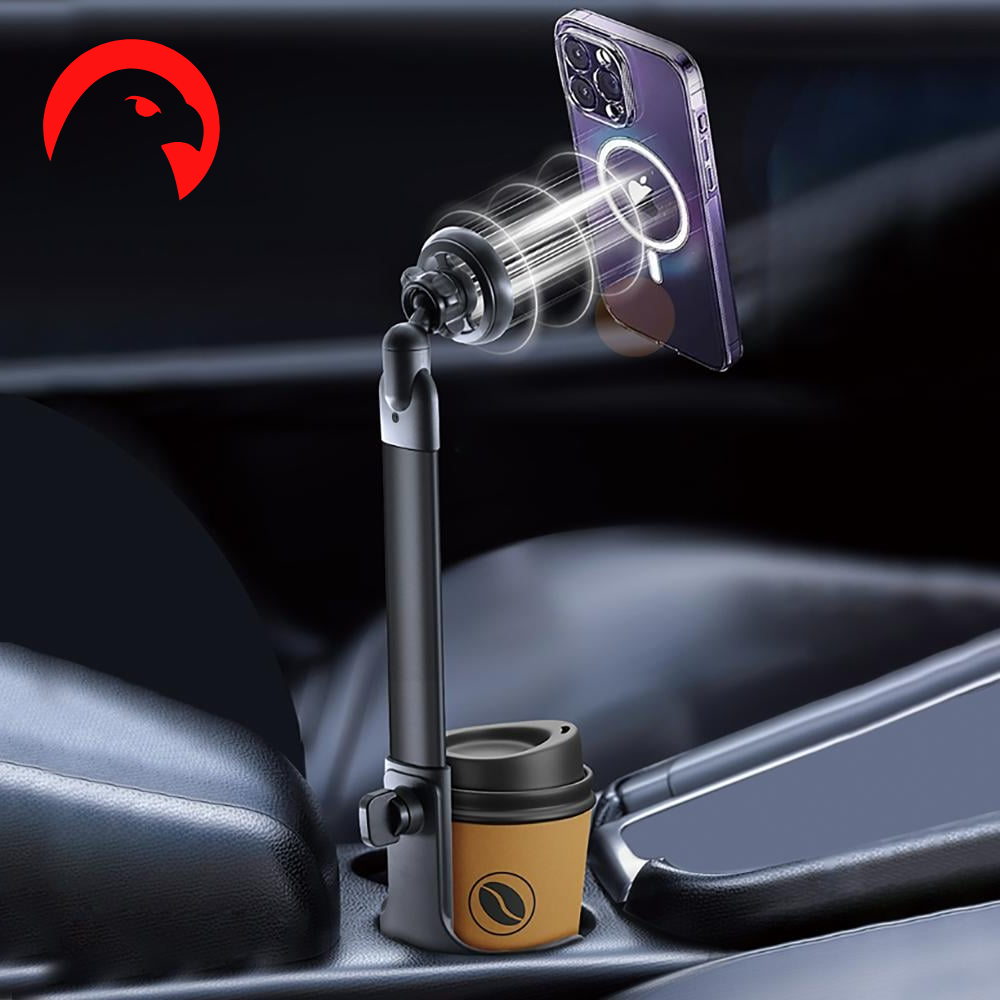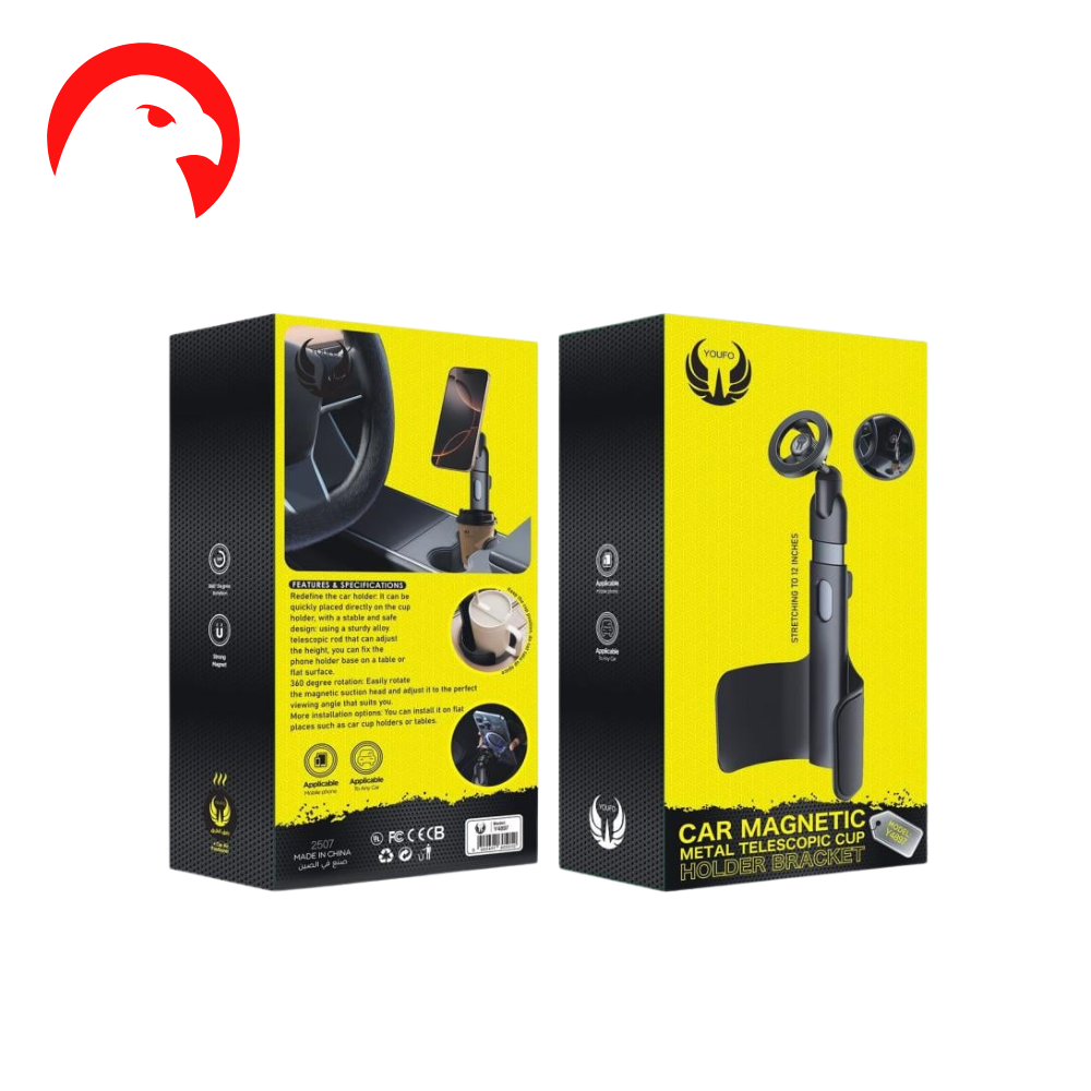 استمتع بقيادة آمنة مع حامل جوال يوفو 2 في 1 المغناطيسي 🤳🔒 تثبيت قوي ومستقر في مكان كوب السيارة، ذراع مرن دوران 360 درجة، وتوافق واسع.